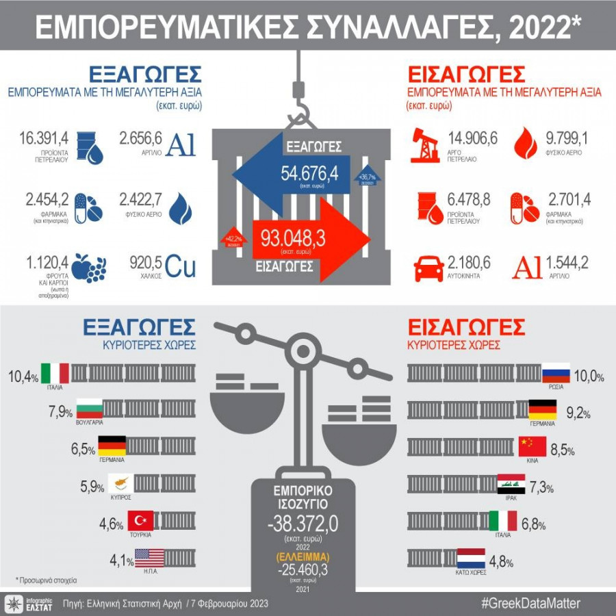 Το έλλειμμα του εμπορικού ισοζυγίου κατά το χρονικό διάστημα Ιανουαρίου-Δεκεμβρίου 2022 ανήλθε σε 38,37 δισ. ευρώ, έναντι 25, 460,3 δισ. ευρώ κατά το ίδιο διάστημα του έτους 2021, παρουσιάζοντας αύξηση 50,7%.