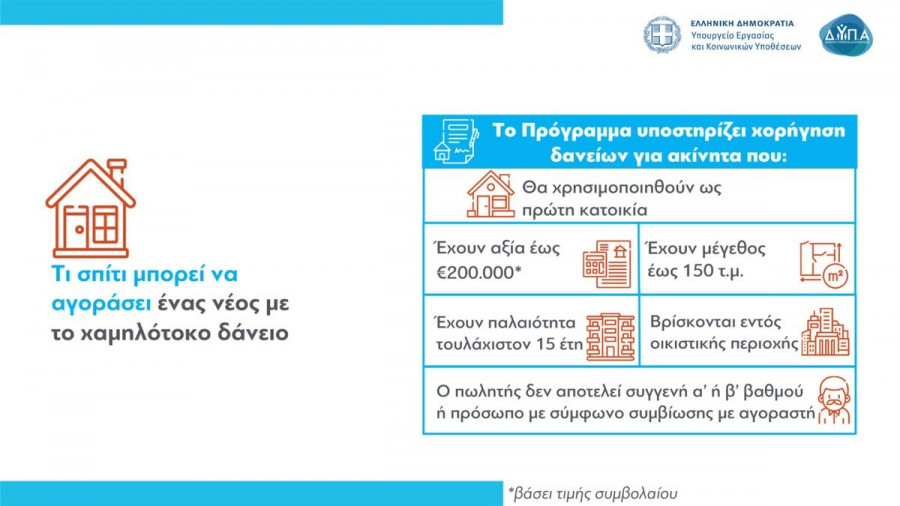 Σημειώνεται ότι το ύψος του δανείου δεν μπορεί να υπερβαίνει τα 150.000 ευρώ και η διάρκεια τα τριάντα έτη, ενώ θα καλύπτει το 90% της αξίας του ακινήτου.