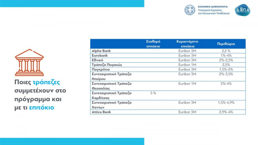 Το 75% του κεφαλαίου θα χορηγείται από τη Δημόσια Υπηρεσία Απασχόλησης (ΔΥΠΑ) και θα είναι άτοκο, ενώ για τους τρίτεκνους και πολύτεκνους (και όσους αποκτήσουν αυτή την ιδιότητα κατά τη διάρκεια αποπληρωμής) το δάνειο θα χορηγείται στο σύνολό του άτοκα. Το υπόλοιπο 25% θα χορηγείται από την εκάστοτε τράπεζα.
