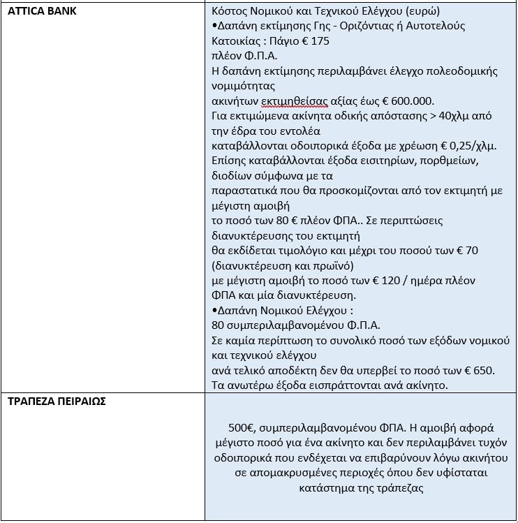 • Τα έξοδα νομικού και τεχνικού ελέγχου για την αγορά του βαρύνουν τον δανειολήπτη και αποτυπώνονται στον πίνακα που ακολουθεί: