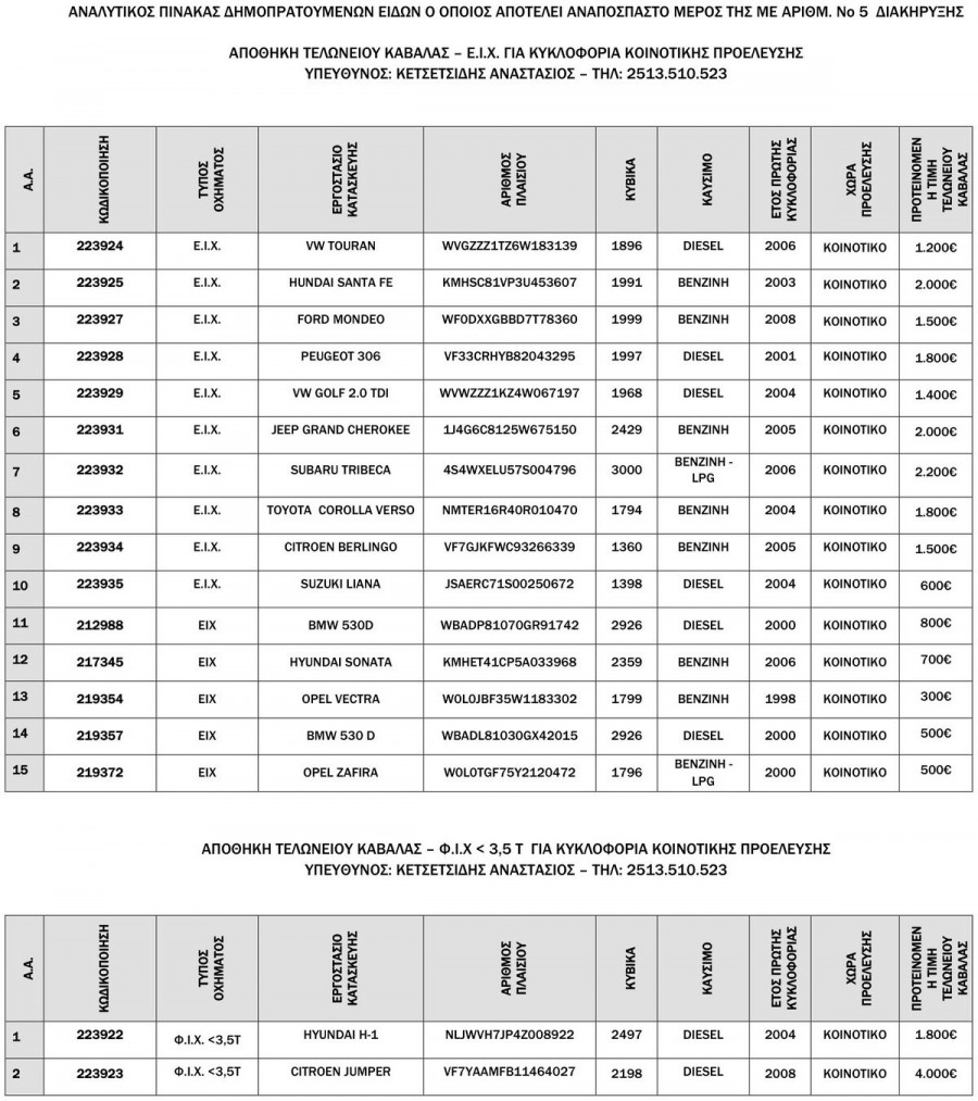 Την 27η Απριλίου 2023 ημέρα Πέμπτη και ώρα 10:00 π.μ. θα διενεργηθεί στις εγκαταστάσεις του Τελωνείου Καβάλας προφορική πλειοδοτική δημοπρασία για να εκποιηθούν δεκαεπτά (17) τροχοφόρα οχήματα: