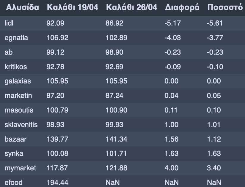 Στο 97,18% των προϊόντων που περιλαμβάνονται στο «Kαλάθι του Nοικοκυριού», οι τιμές μειώνονται ή διατηρούνται σταθερές την 26η εβδομάδα εφαρμογής του (26/4/2023 -2/52023), ενώ η μεσοσταθμική αξία του είναι μειωμένη κατά -1% συγκριτικά με την προηγούμενη εβδομάδα.
