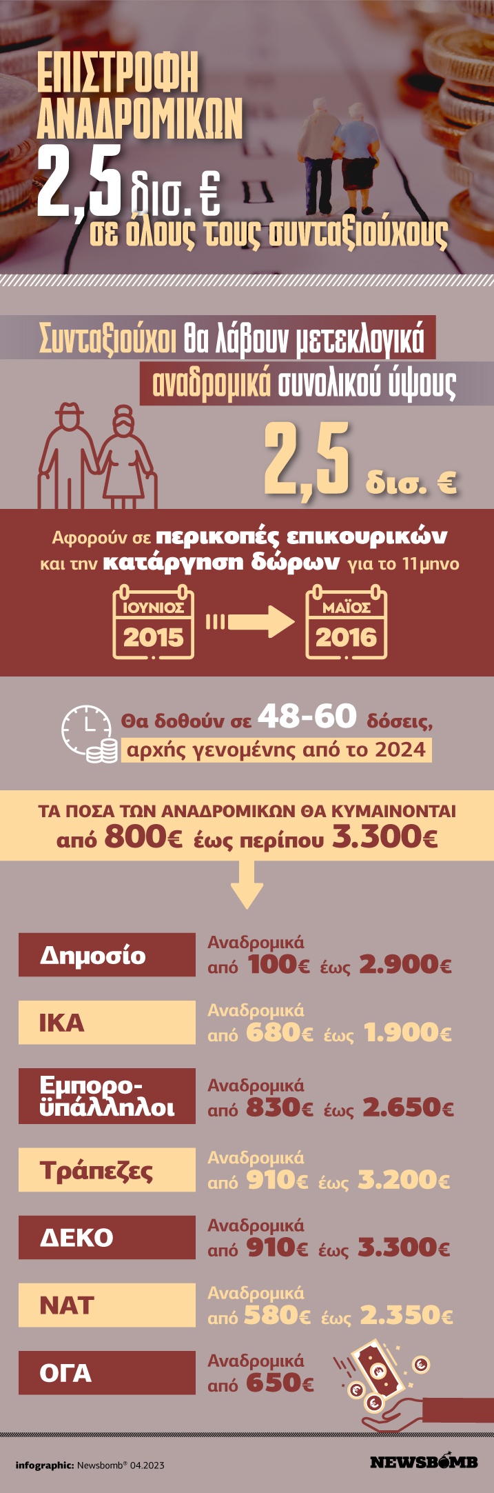 Το πιθανότερο ενδεχόμενο προβλέπει τα αναδρομικά, συνολικού ύψους 2,5 δισ. ευρώ, να δοθούν σε δόσεις, αρχής γενομένης από το 2024, σε βάθος τετραετίας ή πενταετίας.