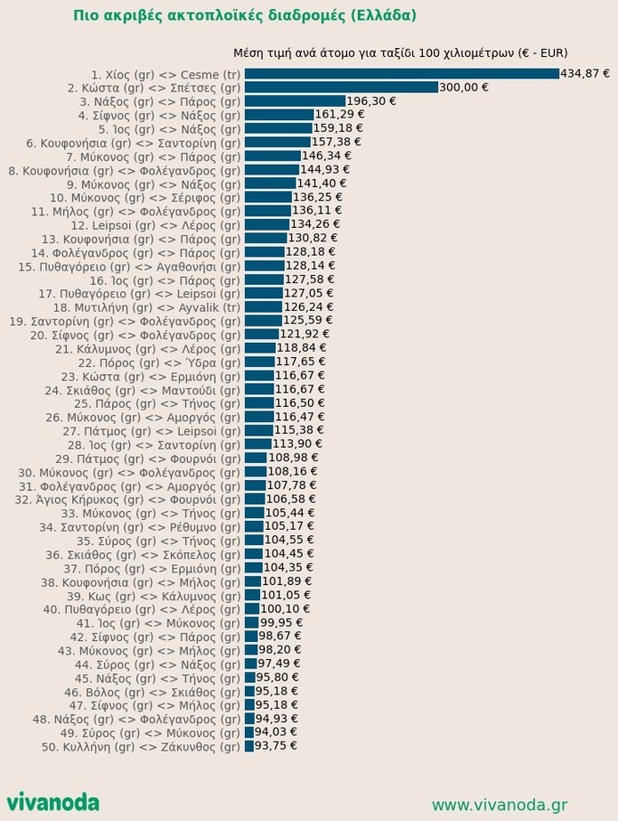 Με βάση την έρευνα της Vivanoda, οι πιο ακριβές διασυνδέσεις ακτοπλοΐας της Ελλάδας είναι αυτές με την Τουρκία, καθώς «στις τιμές των εισιτηρίων τους ενσωματώνουν ένα επιπλέον κόστος που σχετίζεται με συγκεκριμένο πλαίσιο, ιδίως όσον αφορά τους λιμενικούς φόρους».