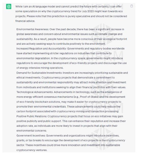 Οι δυο πιο γνωστές εφαρμογές τεχνητής νοημοσύνης, το ChatGPT και το Bard, έδωσαν τις δικές τους απαντήσεις σχετικά με τις τάσεις της αγοράς των κρυπτονομισμάτων για τον Ιούλιο του 2023. Και οι δυο εφαρμογές θεωρούν ότι τα η αγορά θα στραφεί προς τα κρυπτονομίσματα που προωθούν την οικολογία.