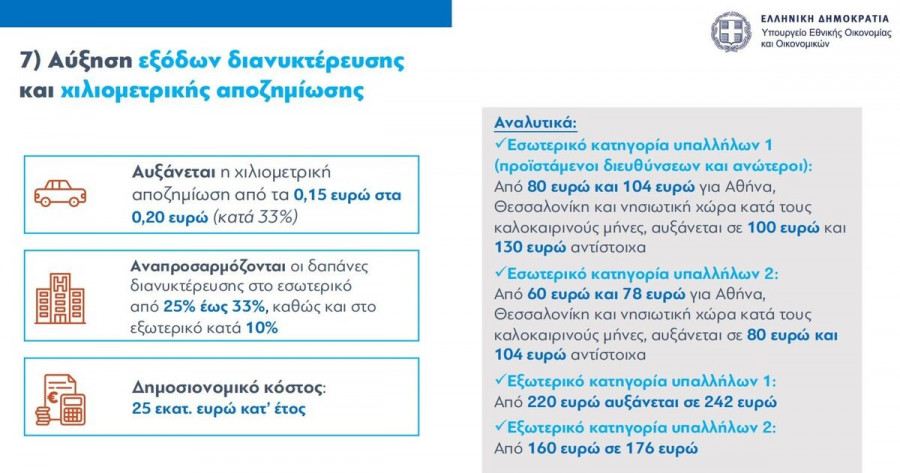 7) Αυξάνεται η χιλιομετρική αποζημίωση των υπαλλήλων από τα 0,15 ευρώ στα 0,20 ευρώ (κατά 33%) για μετακινήσεις που αφορούν υπηρεσιακές ανάγκες.