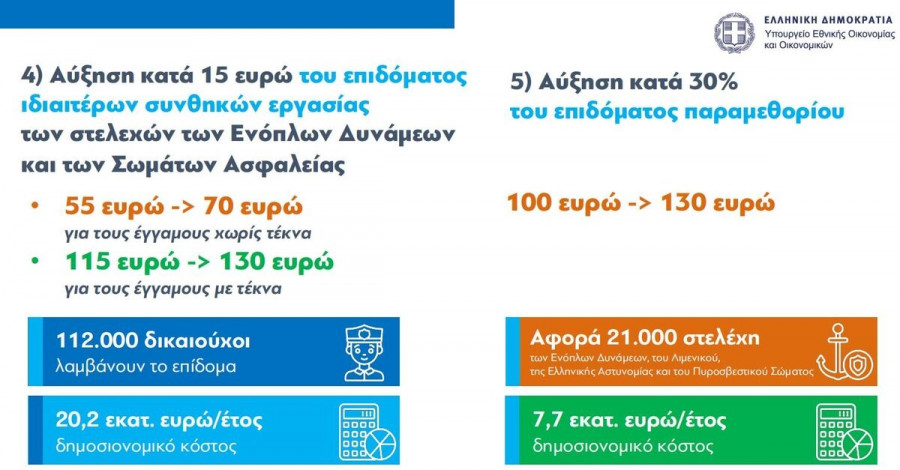 4) Αύξηση κατά 15 ευρώ του επιδόματος ιδιαιτέρων συνθηκών εργασίας των στελεχών των Ενόπλων Δυνάμεων και των Σωμάτων Ασφαλείας που είναι έγγαμοι ή έχουν παιδιά.