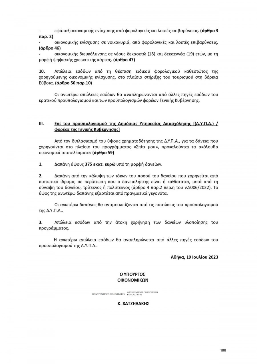 Συνοδεία του νομοσχεδίου είναι ο συμπληρωματικός προϋπολογισμός ύψους 700 εκατ. ευρώ για το 2023. Αφορά δαπάνες που σχετίζονται με τις ενισχύσεις που θα καταβληθούν φέτος (Market Pass, Youth Pass, αύξηση μισθολογίου μελών ΔΕΠ), οι αυτοδιοικητικές εκλογές, ανάγκες του υπουργείου Υγείας.