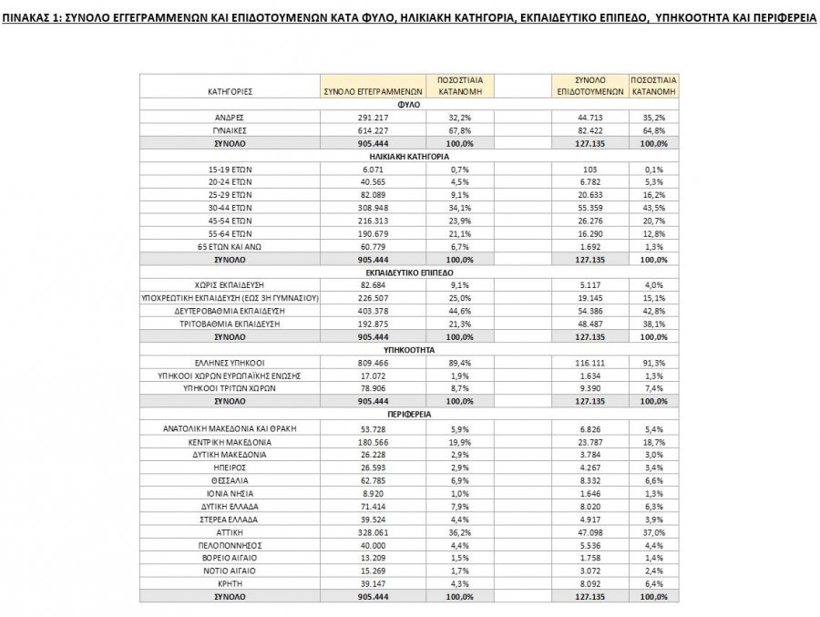 Μεταξύ των Περιφερειών της Χώρας η Περιφέρεια Αττικής και η Περιφέρεια Κεντρικής Μακεδονίας καταγράφουν τον μεγαλύτερο αριθμό εγγεγραμμένων, ο οποίος ανέρχεται σε 328.061 άτομα (ποσοστό 36,2%) και 180.566 άτομα (ποσοστό 19,9%) αντίστοιχα.