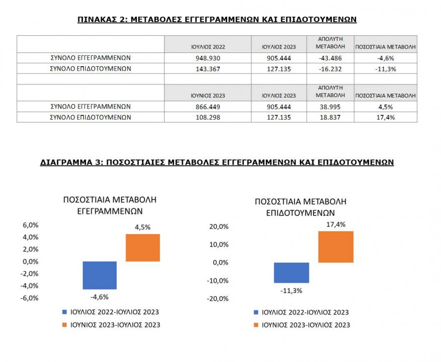 Στον 2ο πίνακα, παρουσιάζονται οι μεταβολές των εγγεγραμμένων και των επιδοτούμενων από τον Ιούλιο του 2022, καθώς και από τον Ιούνιο του 2023.