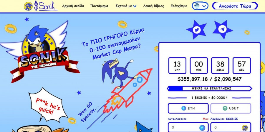 Το $SONIK θέλει να γίνει το πρώτο meme κρυπτονόμισμα που θα τρέξει τόσο γρήγορα, ώστε να φτάσει από το 0 στα 100 εκατομμύρια κεφαλαιοποίησης. Αυτό το κρυπτονόμισμα εμπνέεται από τον Sonic The Hedgehog που είναι ένας αναγνωρίσιμος χαρακτήρας σε όλο τον κόσμο.
