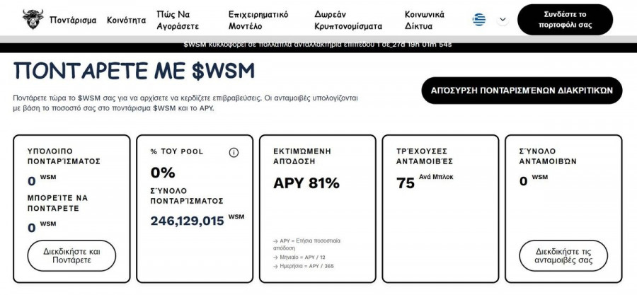 Το Wall Street Memes βασίζεται στο blockchain του Ethereum και ανταμείβει τους κατόχους του WSM για το staking των κρυπτονομισμάτων τους. Κυκλοφορεί σύντομα σε πολλαπλά ανταλλακτήρια επιπέδου 1 και δείχνει μια ανοδική τάση με μεγάλες προοπτικές.