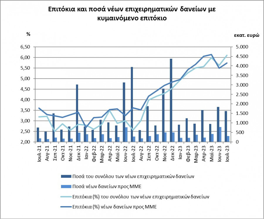 Το μέσο επιτόκιο των νέων επιχειρηματικών δανείων με συγκεκριμένη διάρκεια και κυμαινόμενο επιτόκιο αυξήθηκε κατά 47 μονάδες βάσης, τον Ιούλιο του 2023, και διαμορφώθηκε στο 6,10%. Το μέσο επιτόκιο των δανείων τακτής λήξης με κυμαινόμενο επιτόκιο προς μικρομεσαίες επιχειρήσεις (ΜΜΕ) αυξήθηκε κατά 25 μονάδες βάσης και διαμορφώθηκε στο 5,74%.
