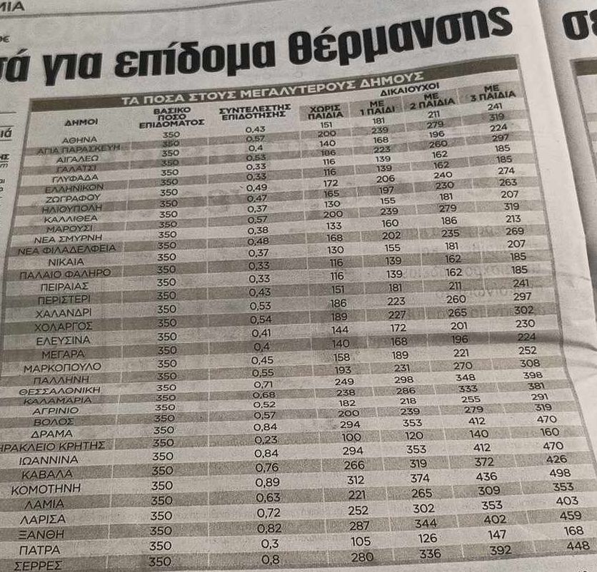 Σχετικά με το πώς θα κινηθούν οι ζώνες στο επίδομα θέρμανσης, η εφημερίδα «Ελεύθερος Τύπος» δημοσίευσε πίνακες με τα ποσά που αναμένεται να πάρουν οι δικαιούχοι σε όλη τη χώρα. Ο ένας πίνακας αφορά τα ποσά στους μεγαλύτερους δήμους της χώρας, ενώ ο δεύτερος τις περιοχές που αναμένεται να έχουν τη χαμηλότερη θερμοκρασία τους χειμερινούς μήνες.