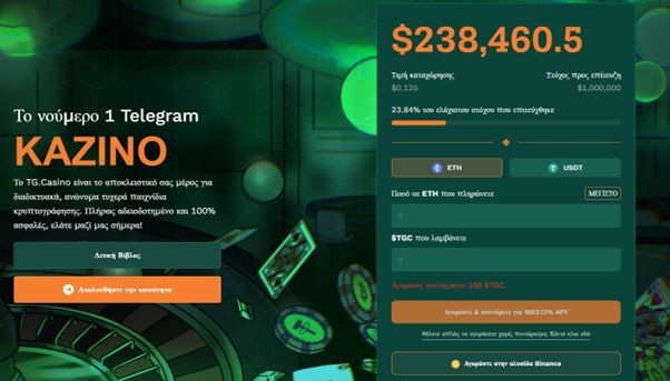 Το TG γεφυρώνει το χάσμα μεταξύ κρυπτονομισμάτων και διαδικτυακών τυχερών παιχνιδιών, προσφέροντας μια σύγχρονη πλατφόρμα καζίνο. Με το ποντάρισμα κρυπτονομισμάτων $TGC, οι επενδυτές εξασφαλίζουν παθητικό εισόδημα. Επιπλέον, ο μηχανισμός επαναγοράς προσθέτει ένα επιπλέον επίπεδο αξίας στα κρυπτονομίσματα $TGC.