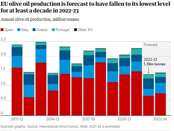O Guardian αναφέρεται και στην Ελλάδα, τονίζοντας ότι η παραγωγή φέτος θα είναι μόλις 200.000 τόνοι, χαμηλότερη από πέρυσι, εξαιτίας της υπερβολικής ζέστης και των προβλημάτων προβλήματα με δάκο και γλοιοσπόριο στις ελιές.