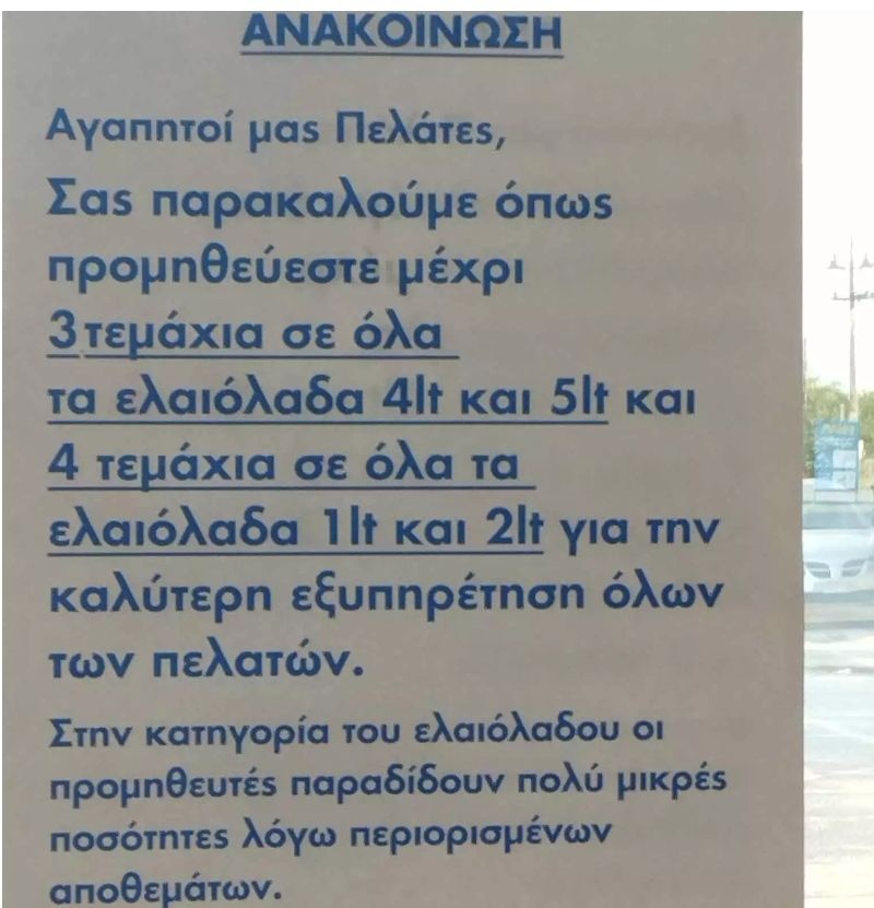 Είναι πλέον γεγονός. Το πρώτο σούπερ μάρκετ στη χώρα μας που έβαλε πλαφόν στις αγορές ελαιόλαδου είναι στη Θεσσαλονίκη, μαρτυρώντας το τεράστιο πρόβλημα που υπάρχει στην αγορά.