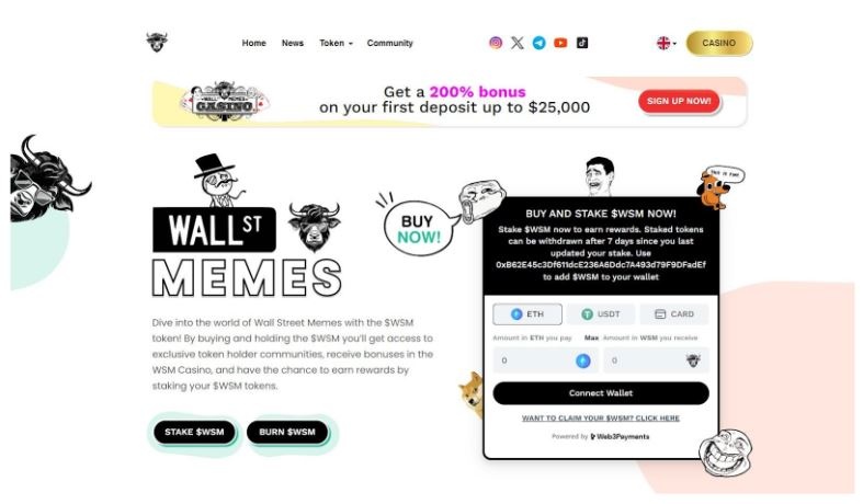 Το Wall Street Memes (WSM) είναι ένα κρυπτονόμισμα που αγκαλιάζει την παιχνιδιάρικη πλευρά των meme coin. Με τιμή κάτω από 1 δολάριο και συγκεκριμένα 0,025$, αποτελεί ένα από τα έργα που σίγουρα αξίζει να παρακολουθήσετε αυτή την εβδομάδα. Παρά το γεγονός ότι ξεκίνησε ως meme coin, το $WSM κυκλοφόρησε πρόσφατα και το δικό του διαδικτυακό καζίνο, ενώ αξιοποιεί και συμβόλαιο staking για ποντάρισμα και παθητικό εισόδημα.