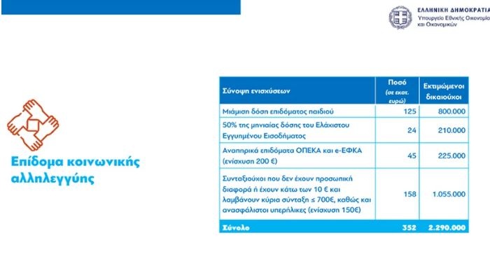 Το συνολικό ύψος του επιδόματος κοινωνικής αλληλεγγύης, που αφορά τέσσερις κοινωνικές ομάδες ευάλωτων οικονομικά πολιτών, ανέρχεται στα 352 εκατ. ευρώ και τα χρήματα προέρχονται από την υπεραπόδοση των φορολογικών εσόδων τον Οκτώβριο.