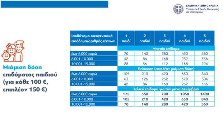 800.000 δικαιούχοι του επιδόματος παιδιού του ΟΠΕΚΑ, θα λάβουν επιπλέον μιάμιση δόση επιδόματος παιδιού. Ενδεικτικά το συνολικό ποσό (αρχικό ποσό συν επιπλέον μιάμιση δόση) που θα λάβει το Δεκέμβριο μια οικογένεια με τρία παιδιά κυμαίνεται από 280 έως 700 ευρώ.