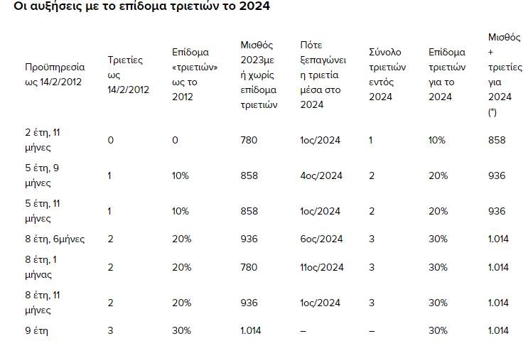 *Εργαζόμενος που το 2024 θα τον βρει να αμείβεται με ατομική σύμβαση θα πάρει προσαύξηση λόγω προϋπηρεσίας, μόνον αν οι αποδοχές του είναι χαμηλότερες από αυτές που θα είχε αν έπαιρνε το βασικό μισθό με τριετίες.