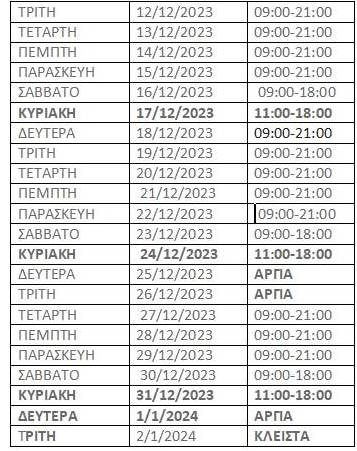 Το Σάββατο 23 Δεκεμβρίου, προπαραμονή των Χριστουγέννων, το ωράριο θα είναι συνεχές, από ώρα 10.00 έως 18.00.