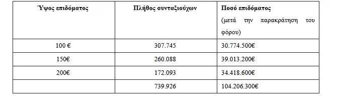 ποσά που κυμαίνονται από 100 – 200 ευρώ σε 730.550 συνταξιούχους, ενώ το συνολικό ποσό που θα διατεθεί ανέρχεται στα 102.8 εκατομμύρια ευρώ.