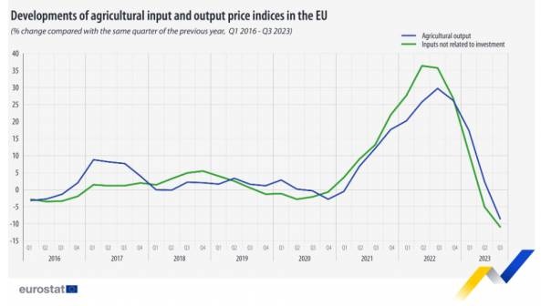 Σύμφωνα με στοιχεία της Eurostat, οι τιμές στο χωράφι μειώθηκαν το γ’ τρίμηνο του 2023 στην Ευρωπαϊκή Ένωση κατά μέσο όρο κατά 9% σε ετήσια βάση, μετά τη σταδιακή αποκλιμάκωση των αυξήσεων τους μετά το γ΄ τρίμηνο του 2022, όταν αυτές είχαν κορυφωθεί (ετήσιος ρυθμός 30%).