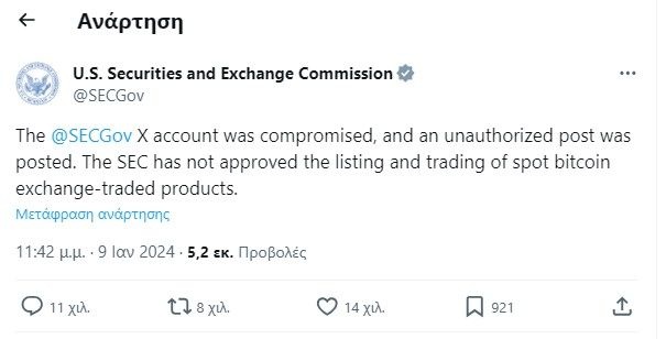«Ο λογαριασμός @SECGov X παραβιάστηκε και αναρτήθηκε μια μη εξουσιοδοτημένη ανάρτηση. Η SEC δεν έχει εγκρίνει την εισαγωγή και διαπραγμάτευση spot bitcoin ETFs», διευκρίνισε η SEC σε μεταγενέστερη ανάρτηση στο X.