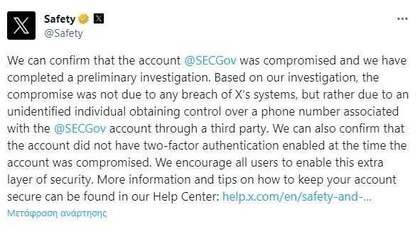 «Με βάση τη μέχρι τώρα έρευνα, η παραβίαση δεν οφείλεται σε παραβίαση των συστημάτων του X, αλλά μάλλον σε άγνωστο άτομο που απέκτησε τον έλεγχο ενός τηλεφωνικού αριθμού που συνδέεται με τον λογαριασμό @SECGov μέσω τρίτου μέρους», ανέφερε το X, επιβεβαιώνοντας ότι ο λογαριασμός της SEC παραβιάστηκε.