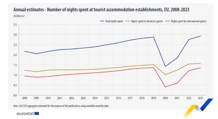 Πρέπει να σημειωθεί ότι και για την ΕΕ το 2023 ήταν έτος – ρεκόρ, με τον αριθμό των διανυκτερεύσεων σε τουριστικά καταλύματα να φθάνει τα 2,92 δις. ευρώ, καταγράφοντας αύξηση κατά 171 εκατομμύρια σε σχέση με το 2022. Κατά το μεγαλύτερο ποσοστό, η αύξηση προήλθε από εξωτερικό τουρισμό (+146 εκατ.), με τις διανυκτερεύσεις από εγχώριους τουρίστες να αυξάνονται κατά 25 εκατ.