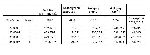 Από τα παραδείγματα προκύπτει ότι οι εισφορές το 2024 μετά την αναπροσαρμογή συνεχίζουν να είναι σημαντικά χαμηλότερες σε σχέση με εκείνες που επέβαλε το 2017 ο νόμος Κατρούγκαλου.