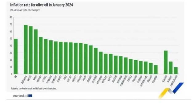 Τον Ιανουάριο του 2024, όλες οι χώρες της ΕΕ ανέφεραν αύξηση του ετήσιου πληθωρισμού για το ελαιόλαδο. Η μεγαλύτερη αύξηση καταγράφηκε στην Πορτογαλία (+69% σε σύγκριση με τον Ιανουάριο του 2023), ακολουθούμενη από την Ελλάδα (+67%) και την Ισπανία (+63%).