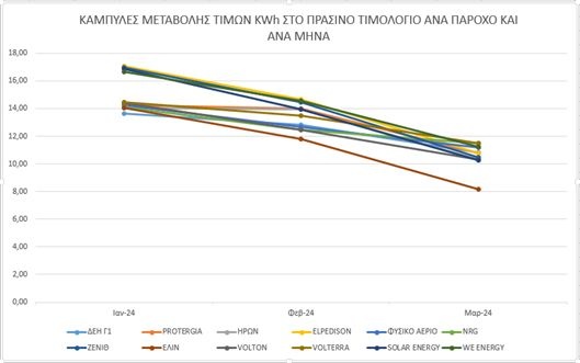 Οι καμπύλες μεταβολής των τιμών χρέωσης ανά μήνα και ανα πάροχο φαίνονται στο γράφημα 2. Η χαμηλότερη τιμή είναι στα 8,18 λεπτά από την ΕΛΙΝΟΙΛ και η ακριβότερη στα 11,50 από την VOLTERRA (βλέπε γράφημα 2).