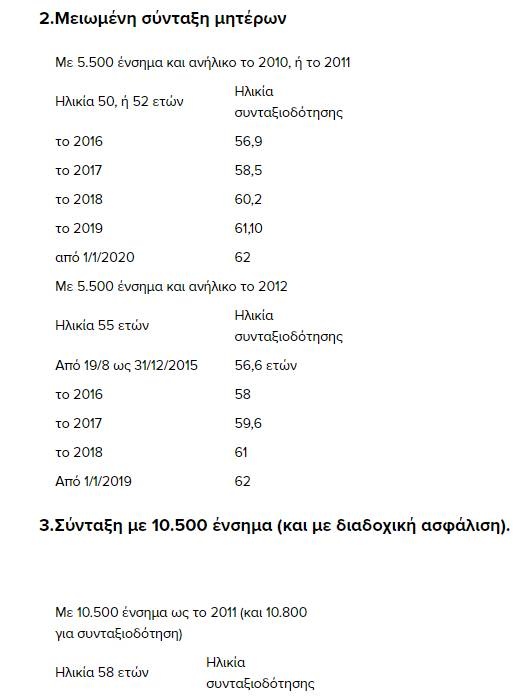 Οι μητέρες με ένσημα ΙΚΑ πριν το 1993, μπορούν να αξιοποιήσουν τις ευκαιρίες συνταξιοδότησης σε ηλικίες από 58,6 ετών εφόσον: α) συμπληρώνουν 5.500 ημέρες ασφάλισης ως το 2012, β) έχουν και ανήλικο τέκνο με τις 5.500 ημέρες ασφάλισης γ) συμπληρώνουν τα παλιά όρια ηλικίας που θα έπαιρναν σύνταξη (50 ως 57 ετών για μειωμένη και πλήρη) στο διάστημα από 19/8/2015 ως 31/12/2021.
