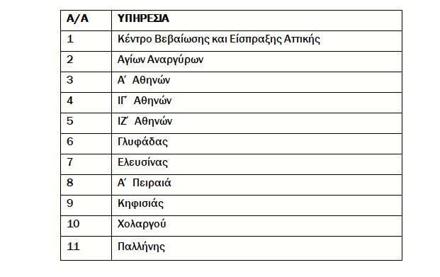 Περαιτέρω, λαμβάνοντας υπόψη τις ημερήσιες συναλλαγές ταμείου στις ΔΟΥ της Αττικής, μετά τη σύσταση του Κέντρου Βεβαίωσης και Είσπραξης Αττικής, με Απόφαση του Διοικητή της ΑΑΔΕ, από τις 26 Μαρτίου 2024, θα παρέχονται υπηρεσίες ταμείου για την έκδοση διπλοτύπου παραστατικού είσπραξης τύπου Α’ αποκλειστικά από τις παρακάτω υπηρεσίες: