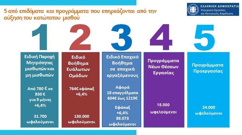 Η αύξηση του κατώτατου μισθού συμπαρασύρει προς τα πάνω τριετίες, δώρα και 13 κατηγορίες επιδομάτων και παροχών, όπως την τακτική επιδότηση ανεργίας, την ειδική παροχή μητρότητας, το επίδομα γονικής άδειας, το ειδικό βοήθημα ευάλωτων ομάδων, το ειδικό εποχικό βοήθημα και το επίδομα εργασίας