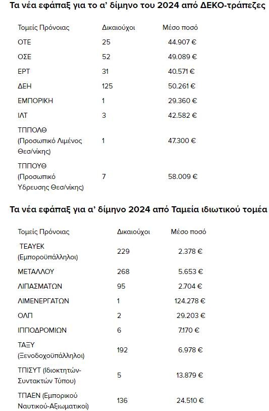 Τα νέα εφάπαξ που θα πάρουν οι εν αναμονή, αλλά και οι υποψήφιοι συνταξιούχοι, από 8 τομείς Πρόνοιας των ΔΕΚΟ και τραπεζών, διαμορφώνονται με βάση τις πρώτες πληρωμές του 2024 ως εξής: