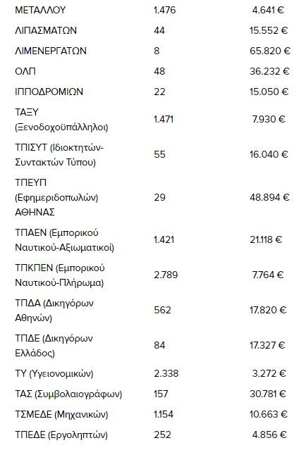 Για τα υπόλοιπα Ταμεία του ιδιωτικού τομέα το εφάπαξ είναι από 2.300 ευρώ (ΤΕΑΥΕΚ) ως 17.300 ευρώ (Τομέας Πρόνοιας Δικηγόρων Αθήνας).