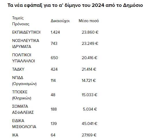 Τα νέα εφάπαξ για το Δημόσιο, σύμφωνα με τον αποκαλυπτικό πίνακα που δημοσιεύει το ένθετο «Ασφάλιση και Συντάξεις», με βάση τις πληρωμές του πρώτου διμήνου του 2024, διαμορφώνονται ως εξής: