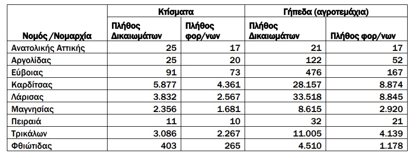 Με βάση τις αιτήσεις απαλλαγής που υποβλήθηκαν στην πλατφόρμα Αρωγή (arogi.gov.gr), η ΑΑΔΕ προχώρησε συνολικά σε απαλλαγές από τον ΕΝΦΙΑ 2024 σε 11.230 ΑΦΜ, για 15.706 δικαιώματα ιδιοκτησίας επί κτιρίων μετά του αναλογούντος οικοπέδου και σε 25.432 ΑΦΜ για 86.456 δικαιώματα ιδιοκτησίας επί αγροτεμαχίων.