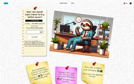 Το Slothana ($SLOTH) αποτελεί ένα επίσης από τα καλύτερα meme coins της αγοράς αυτήν τη στιγμή, το οποίο σημειώνει μια εξαιρετική προπώληση. Ο αστείος χαρακτήρας του Sloth σε συνδυασμό με την αυξημένη ζήτηση των meme coins στο Solana blockchain, έχει οδηγήσει στην συγκέντρωση πάνω από 10 εκατομμυρίων δολαρίων για το έργο.