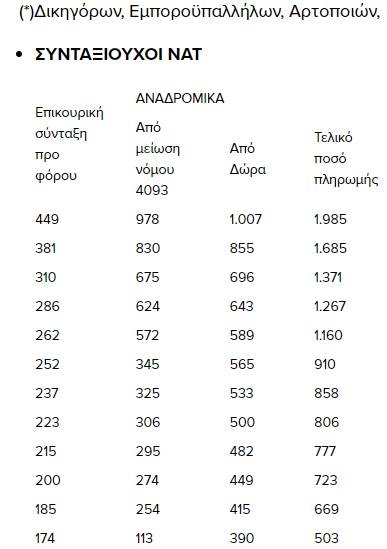 - Για συνταξιούχους λοιπών επικουρικών ταμείων (Δικηγόρων, Εμποροϋπαλλήλων, Αρτοποιών, κ.ά.) αναδρομικά από 668 ευρώ ως 2.399 ευρώ.