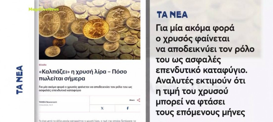 Ρεπορτάζ της εφημερίδας τα «Νέα», «Για μία ακόμα φορά ο χρυσός φαίνεται να αποδεικνύει τον ρόλο του ως ασφαλές επενδυτικό καταφύγιο. Η αξία πώλησης της χρυσής λίρας Αγγλίας παλαιάς κοπής ανέβηκε σήμερα σε υψηλό 16 ετών, στα 613,42 ευρώ. Και στα 509,17 ευρώ την τιμή αγοράς, που η ίδια η κεντρική τράπεζα της χώρας προσφέρει σε όσους προχωρούν σε ρευστοποιήσεις. Αρχές Απριλίου η τιμή αγοράς της χρυσής λίρας βρέθηκε στα 580 ευρώ, ενώ τον Δεκέμβριο του 2023 οι ιδιώτες λάμβαναν από την Τράπεζα της Ελλάδος (ΤτΕ) 431,38 ευρώ ανά τεμάχιο και αγοράζουν από αυτήν στα 519,80 ευρώ».