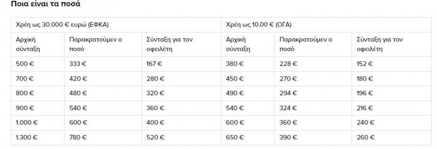 Η παρακράτηση του 60% της σύνταξης θα διαρκεί μέχρι το χρέος να πέσει στις 20.000 ευρώ όσον αφορά τον ΕΦΚΑ και στις 6.000 ευρώ όσον αφορά τον ΟΓΑ. Από το όριο αυτό και μετά θα καταβάλλεται ολόκληρη η σύνταξη και η υπόλοιπη οφειλή θα παρακρατείται από τη σύνταξη σε 60 δόσεις.