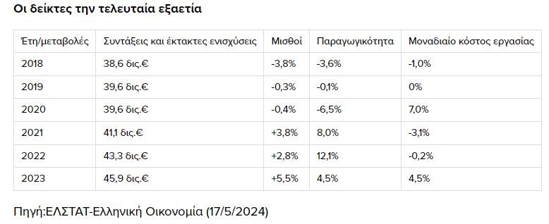 Υπενθυμίζεται ότι ο κατώτατος μισθός αυξήθηκε το 2023 κατά 9,6%. Η μεταβολή του μπορεί να αφορά ένα 25% από τα 2,5 εκατ. μισθωτών του ιδιωτικού τομέα, αλλά έδωσε έναυσμα για αυξήσεις αποδοχών στο σύνολο σχεδόν των εργαζομένων έστω και με μικρότερα ποσοστά.