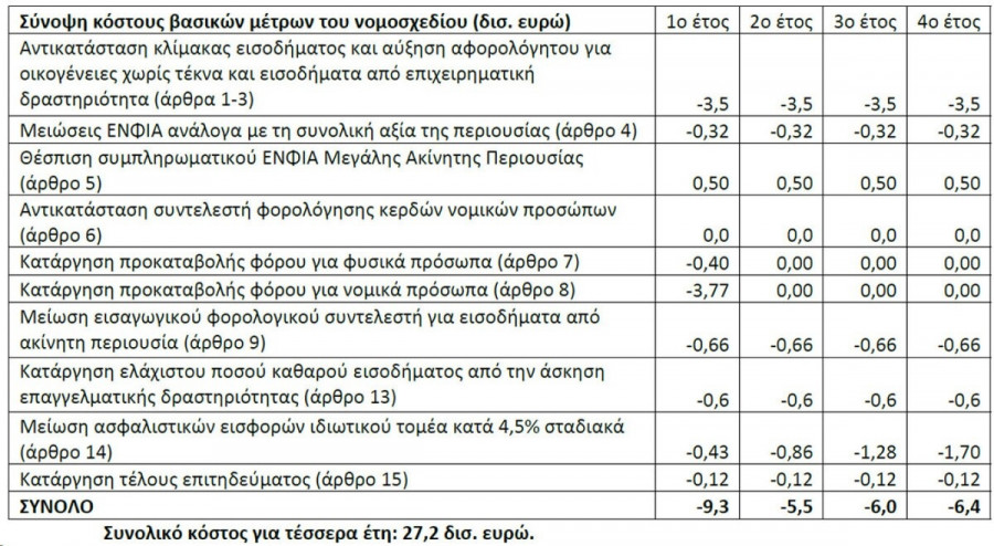 - Από το μέτρο προκαλείται εκτιμώμενη καθαρή απώλεια εσόδων ύψους 0,43 δισ. ευρώ το 1ο έτος, 0,86 δισ. ευρώ το 2ο έτος, 1,28 δισ. ευρώ το τρίτο έτος και 1,7 δισ. ευρώ το 4ο έτος εφαρμογής. Η συνολική απώλεια εσόδων ανέρχεται σε 4,27 δισ. ευρώ στην τετραετία.