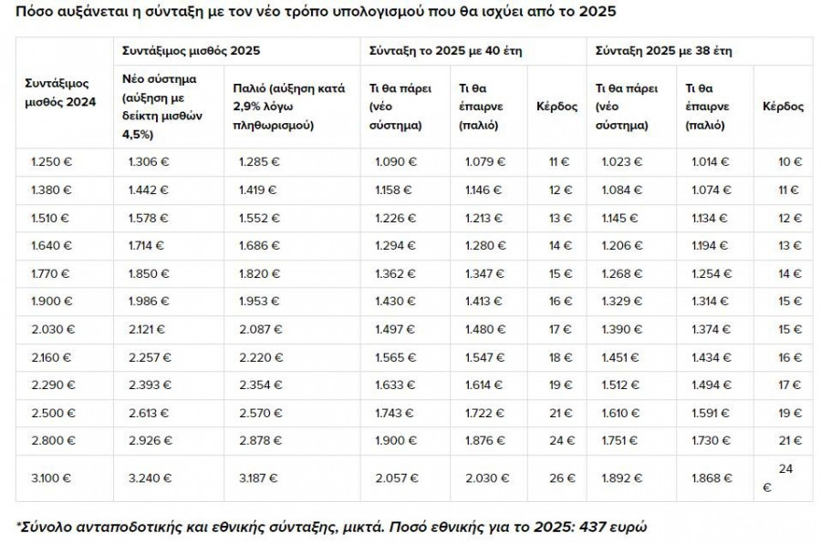 - Ασφαλισμένος με συντάξιμο μισθό 2.000 ευρώ που θα βγει στη σύνταξη το 2025 θα έχει αύξηση 4,5% από τον δείκτη μισθών του 2024. Ο συντάξιμος μισθός θα διαμορφωθεί στις 2.090 ευρώ. Αν έχει 40 χρόνια ασφάλισης, η ανταποδοτική σύνταξη που θα λάβει βγαίνει στα 1.045 ευρώ. Αν οι αποδοχές του αυξάνονταν με τον πληθωρισμό του 2024, που προβλέπεται κάτω από 3%, ο συντάξιμος μισθός θα ήταν 2.060 ευρώ και η ανταποδοτική σύνταξη 1.030 ευρώ. Το κέρδος από το νέο σύστημα είναι 15 ευρώ επιπλέον στην ανταποδοτική σύνταξη.