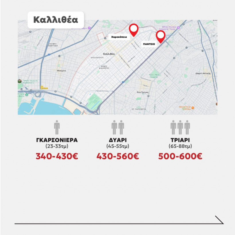 Στην Καλλιθέα όπου έχουμε Πάντειο και Χαροκόπειο Πανεπιστήμιο, μια γκαρσονιέρα από 22 έως 33 τετραγωνικά μέτρα νοικιάζεται από 340 έως 430 ευρώ, ένα δυάρι από 45 έως 55 τετραγωνικά από 430 έως 560 ευρώ και ένα τριάρι από 500 έως 600 ευρώ.