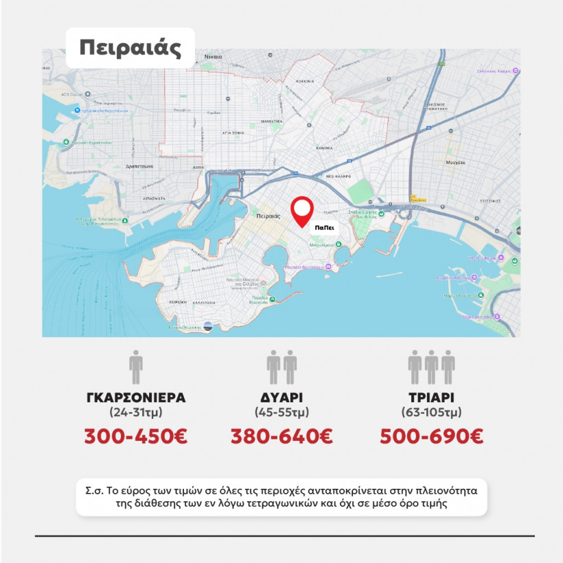 Στον Πειραιά τέλος, και στην ευρύτερη περιοχή κοντά στο Πανεπιστήμιο Πειραιά μια γκαρσονιέρα νοικιάζεται από 340 έως 430 ευρώ, ένα δυάρι από 430 έως 560 ευρώ και ένα τριάρι από 500 έως 600 ευρώ.